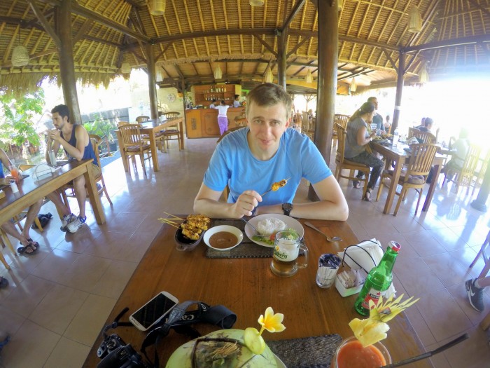 Hurááááá, konečně nějaký skutečný balijský zážitek. Bohužel se nejedná o bezlepkovou dobrotu, ale Kája si svou večeři náramně užil. Spokojeni si vychutnáváme naši druhou noc na Bali a těšíme se na další den, kdy se již přesouváme k moři, konkrétně na nedaleký ostrov Nusa Ceningan.