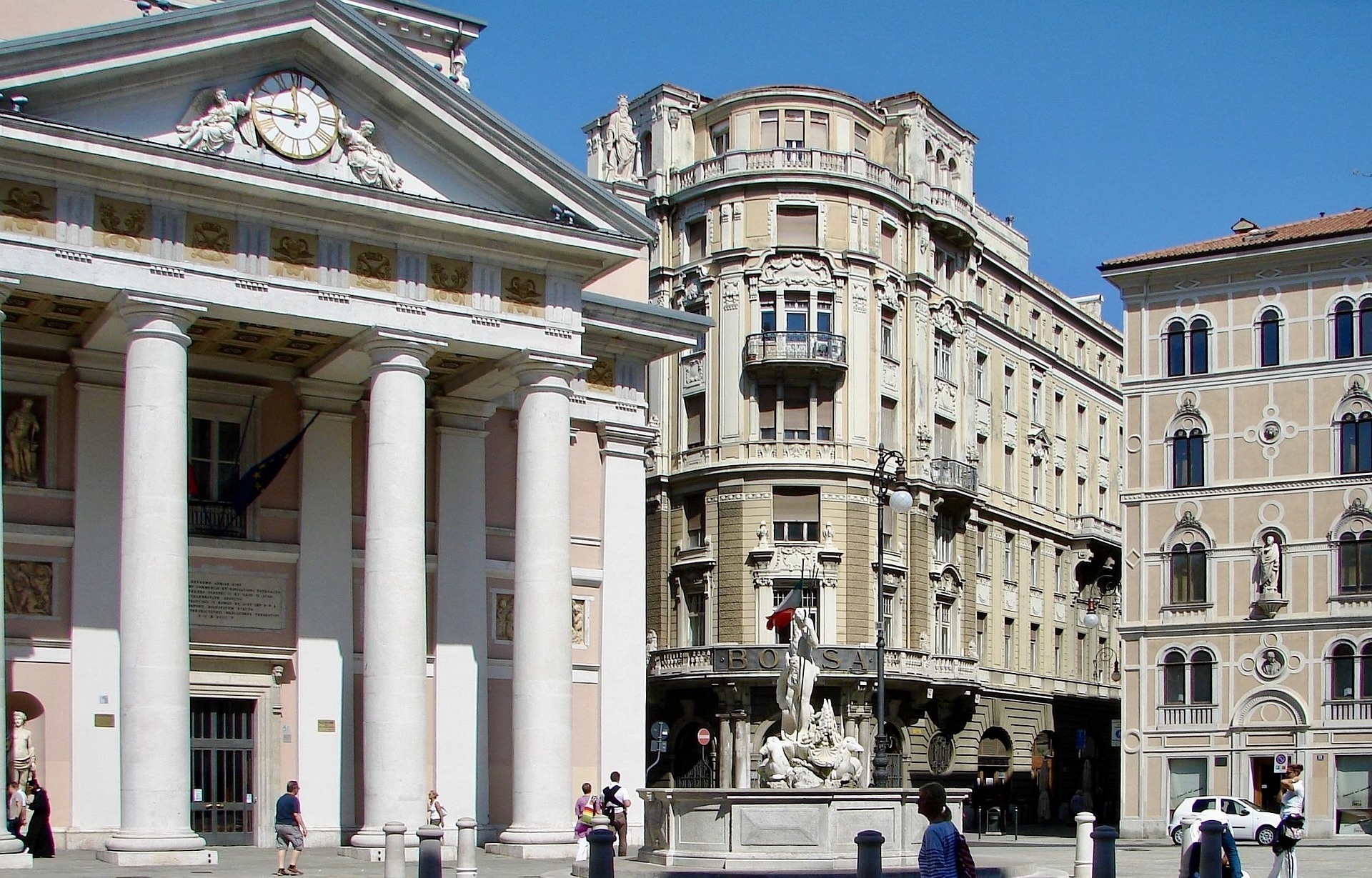 Piazza della Borsa is one of Trieste’s main squares and used to be the center of the city’s commercial and financial life. Today, everyday city life pulses around the neoclassical former stock exchange building from the 19th century, complemented by cafes, shops, and the busy atmosphere of the historic center.