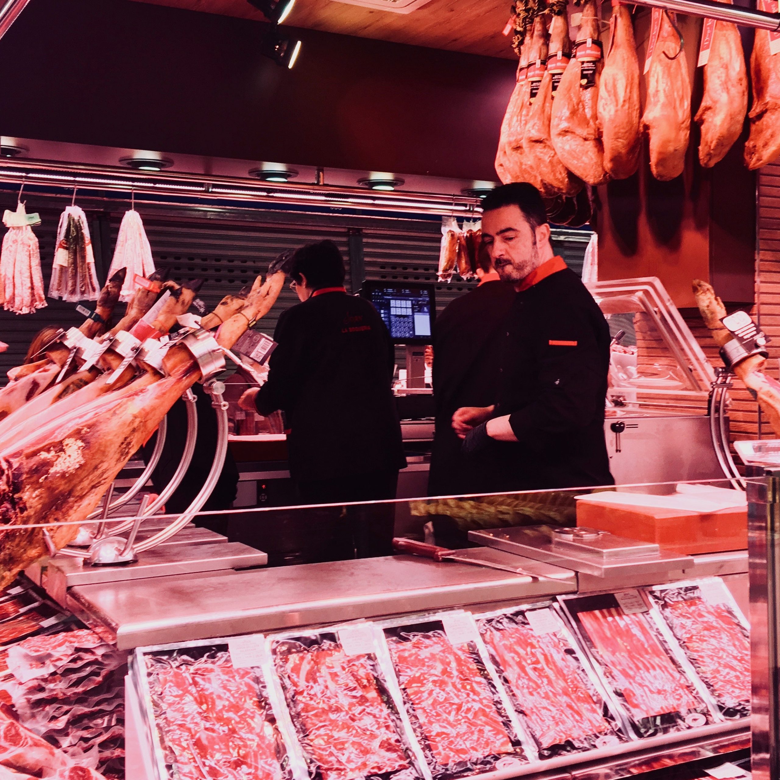 - Continue along the famous La Rambla, where artists, the scent of flowers, and stalls with delicacies mix. Stop at the Boqueria market, the oldest and liveliest market in the city, where you can taste fresh seafood or local traditional dried ham, jamón ibérico.
