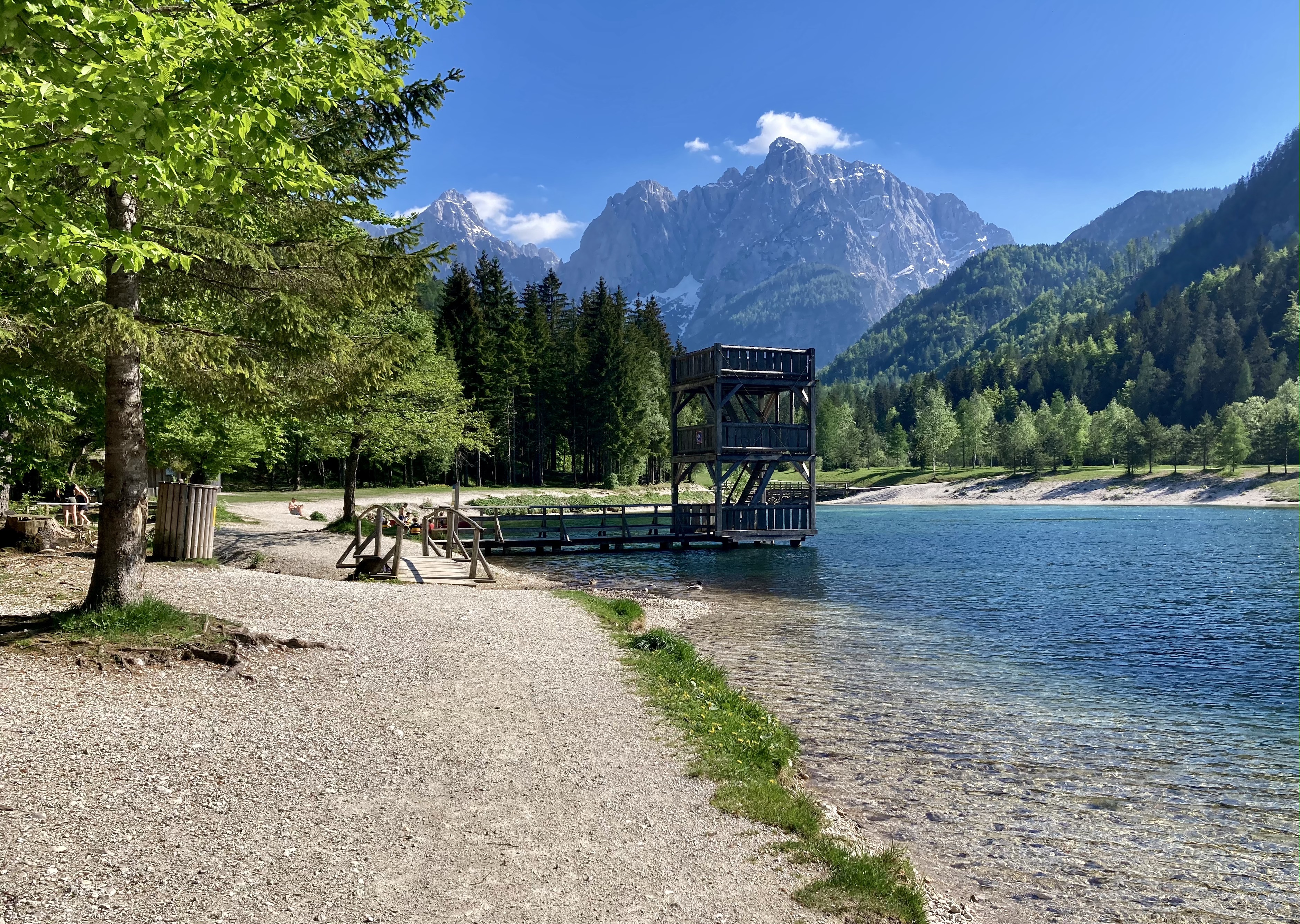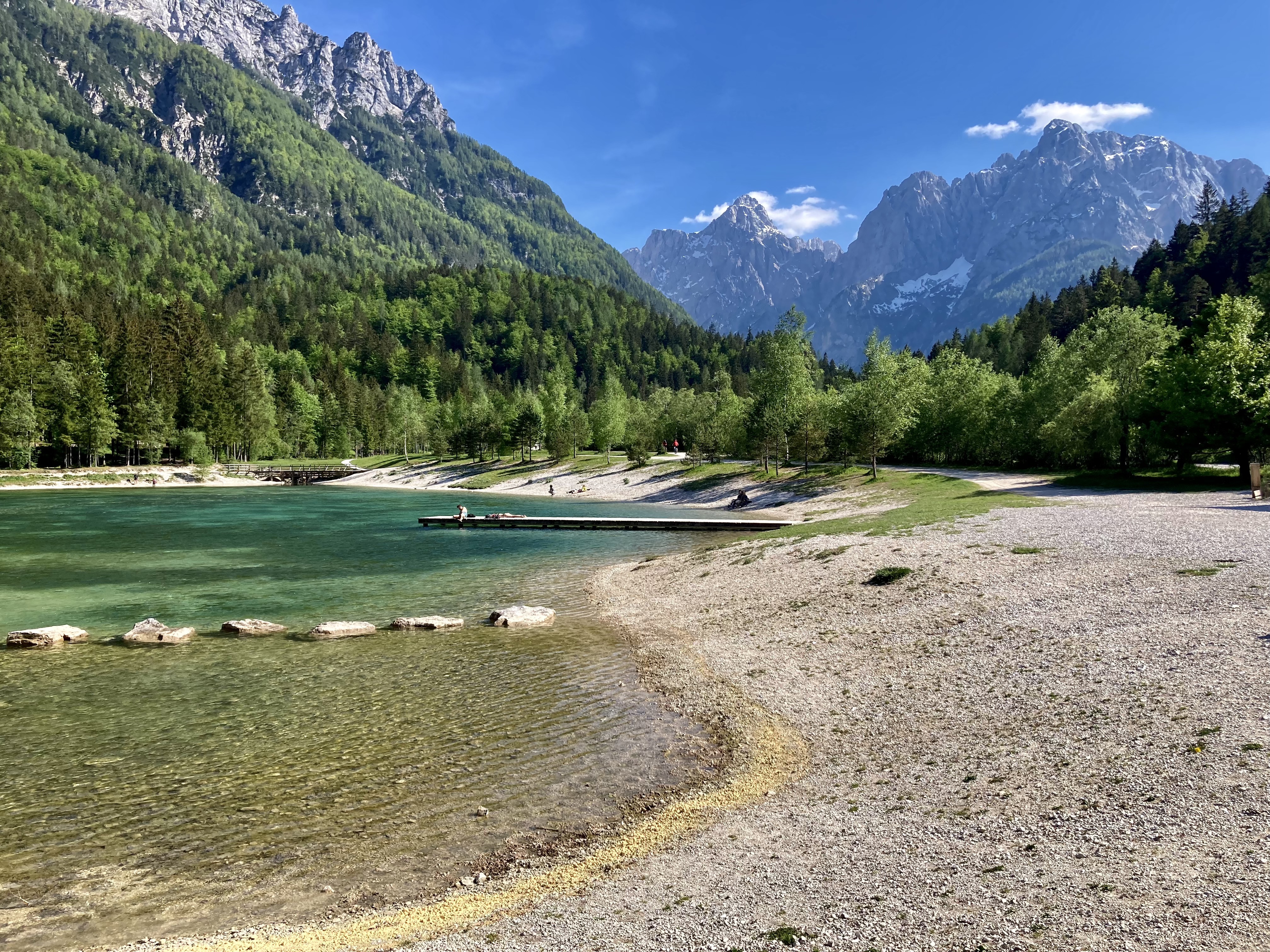 U jezera se nachází dřevěné molo a malé pláže, odkud je snadný přístup do vody. Je ale dobré vědět, že jezero Jasna ve Slovinsku je poměrně hluboké, takže pokud si nejste jistí svými plaveckými schopnostmi v ledové vodě, raději se držte blízko břehu. Během naší poslední dovolené ve Slovinsku, bylo možné jít na jezero Jasna i s paddleboardem či kajakem. Navíc je možné půjčit si SUP i přímo v hotelu u jezera.