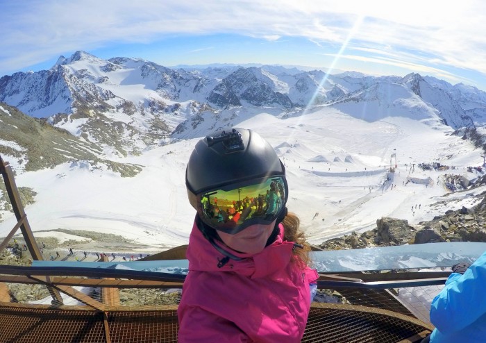 Pokud se sem vydáte, určitě nesmíte vynechat ani výstup na vrchol výhlídky v nejvyšší stanici ve výšce 3.210m. Dojedete sem pohodlně kabinkovou sedačkou. Pokud se vám schody nechtějí stoupat v nepohodlných lyžákách, doporučuji si přibalit do batohu botasky a nahoře se před výstupem přezout. Když budete mít štěstí na slunečné počasí, jako jsme ho měli my, nabídne se vám z vrcholu úchvatný výhled na okolní vrcholy.