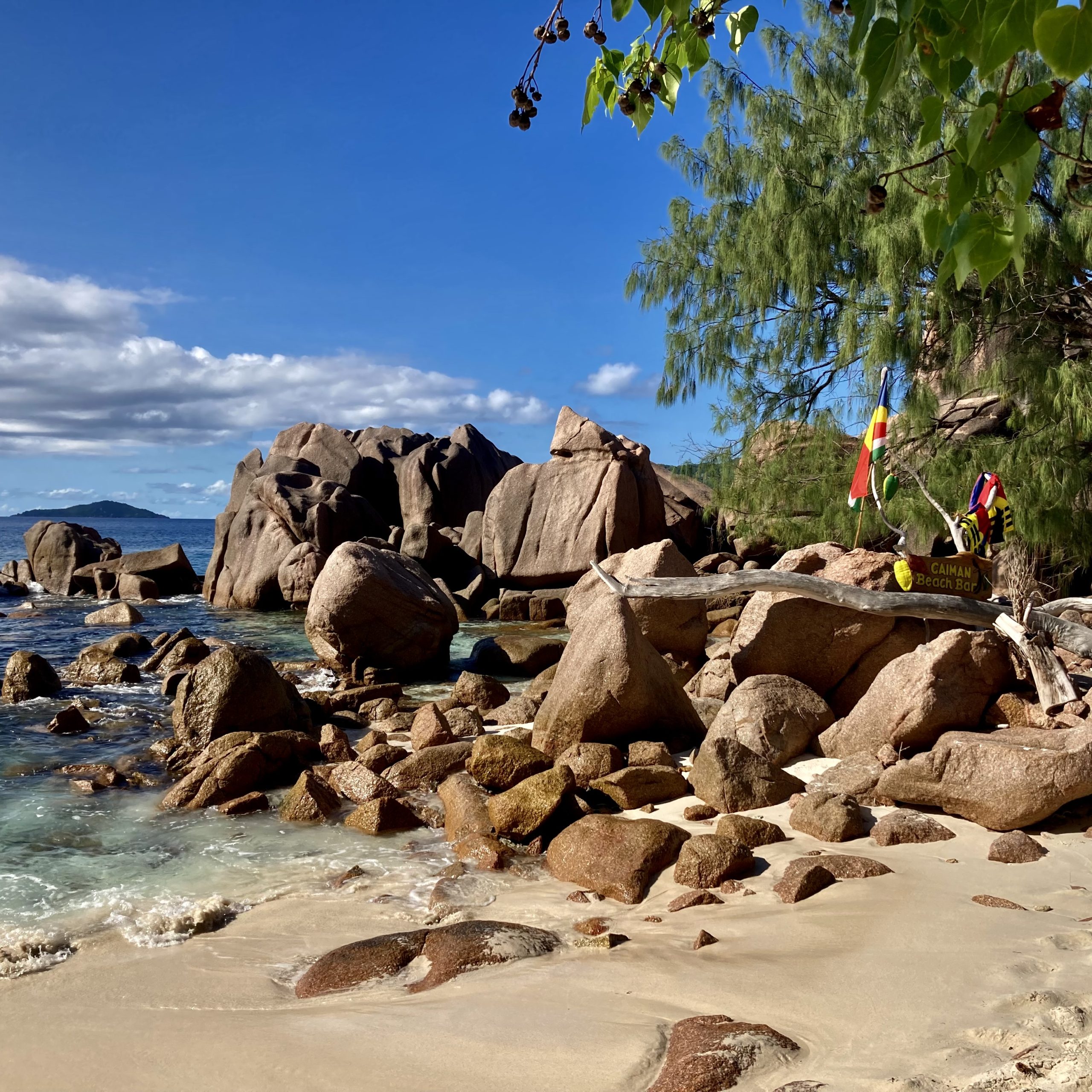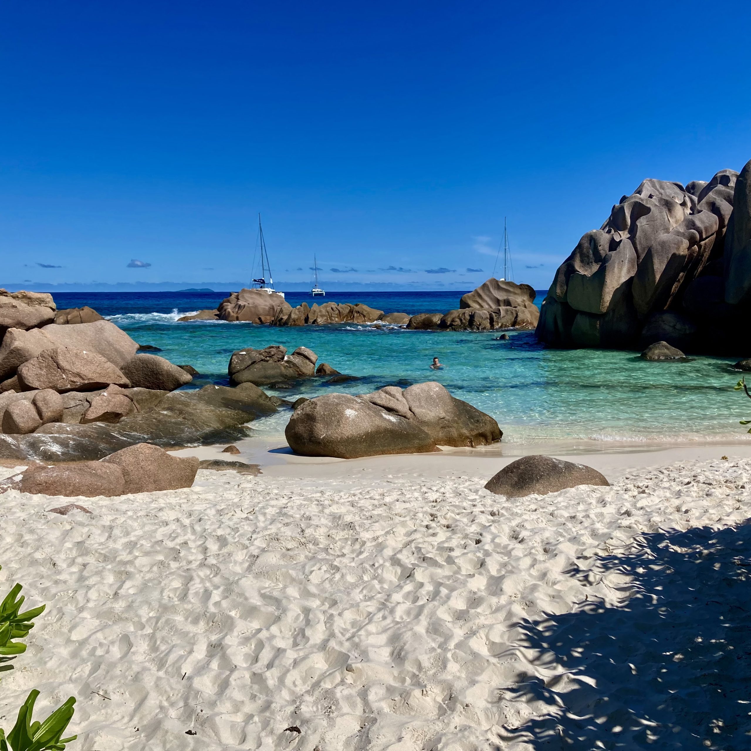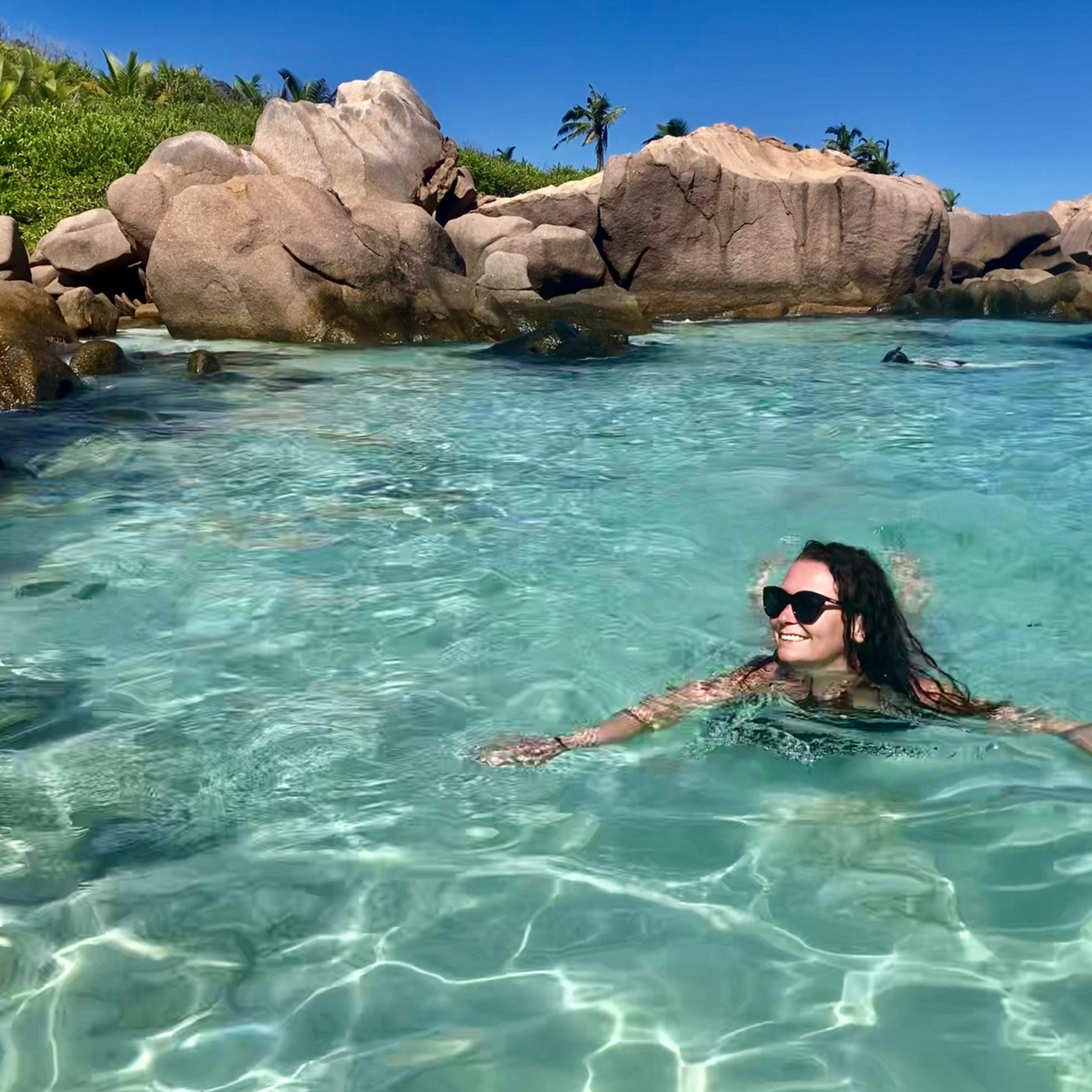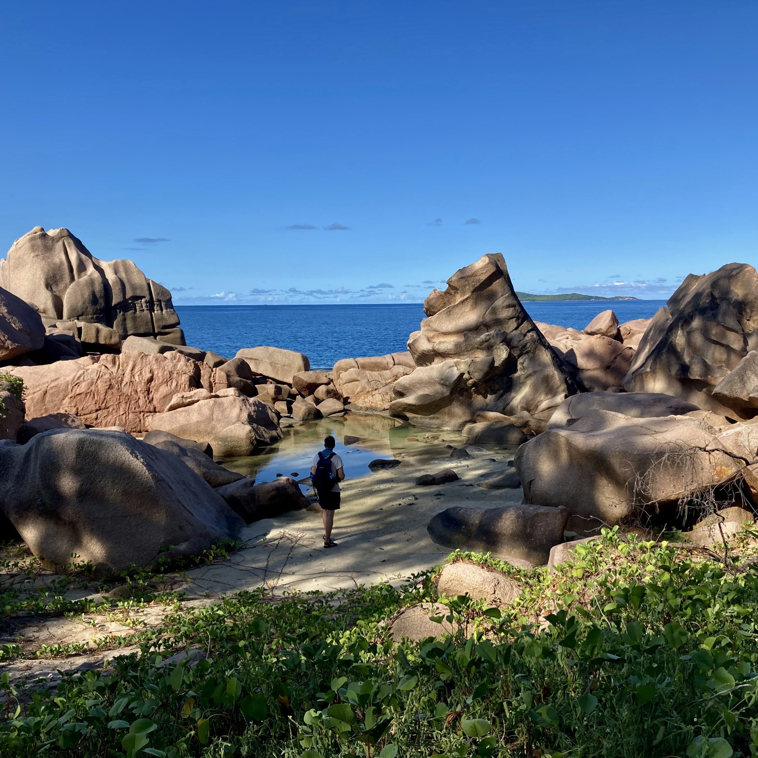Jedny z najčastejších otázok, ktoré k Seychelám dostávam, sú, ktoré výlety na La Digue a ďalších ostrovoch by som odporučila a aké pláže nevynechala. Tieto otázky sa opakujú stále dokola, a preto rovno odpovedám, že keby sme si mali vybrať len jednu pláž z tohto treku, na ktorej by sme strávili pokojne celý deň, bola by to Anse Cocos. Prichádzame na pláž okolo obeda a slnko má dnes naozaj silu. Skúšame dôjsť do zadnej časti, k tzv. bazéniku zo skál, kde sa dá príjemne kúpať aj šnorchlovať.