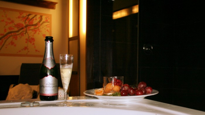 Většina z naší skupiny šla odpočívat znavena na pokoj a přiznám se, že i mě lákal spíš odpočinek v mé vlastní vaně. Naštěstí mě kolegyně Jana přemluvila, ať jdu s ní a nestačily jsme žasnout, jaké královské hody pro nás připravili. Šampaňské, jahody a další ovoce. Já jsem na otevírání šampaňského levá, ale Jana se toho zhostila s odhodláním, a tak jsme si užily soukromého relaxu se vším všudy. Stejně tak si tento wellness zážitek můžete užít i vy při vašem vlastním pobytu v tomto lázeňském hotelu.