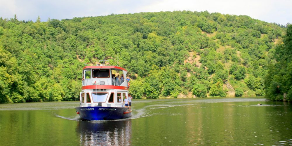 Jinak je nedaleko parkoviště placené. Na lístky na parník byla docela fronta a loď měla již odjíždět. Nastupujeme tedy přímo a zpáteční jízdenku si kupujeme až na palubě. Jezdí se tu doslova přesně na minuty. Podle počtu našich spolucestujících je vidět, že plavba je oblíbenou brněnskou atrakcí. Není se však čemu divit, když se nám po pátečním propršeném dni sobota s počasím umoudřila.