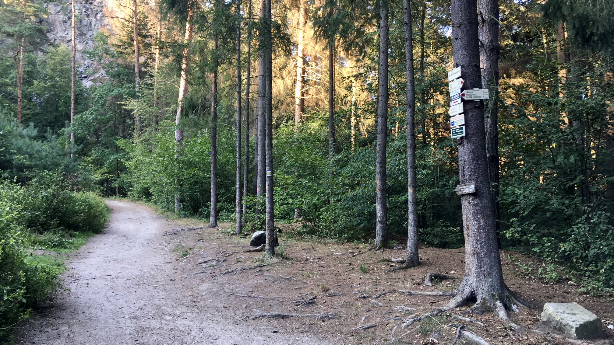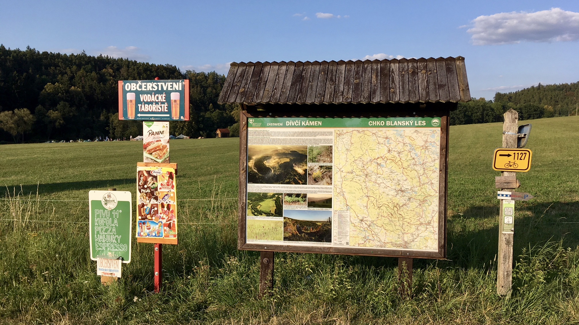 Výlety po Čechách, zřícenina hradu Dívčí Kámen – okruhy začínají na tomto rozcestí – my se vypravujeme rovně a zleva se poté vracíme / foto: Petra Švehlová Stowasserová