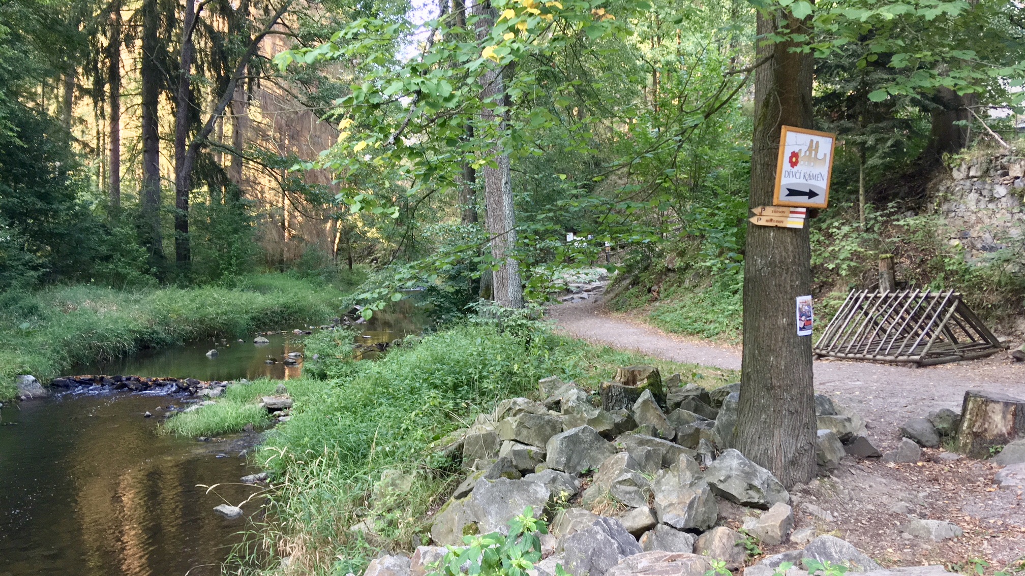 Výlety po Čechách, zřícenina hradu Dívčí Kámen – od tohoto stromu vlevo po kamenech přes les – nebo rovně kolem řeky k pensionu s restaurací / foto: Petra Švehlová Stowasserová